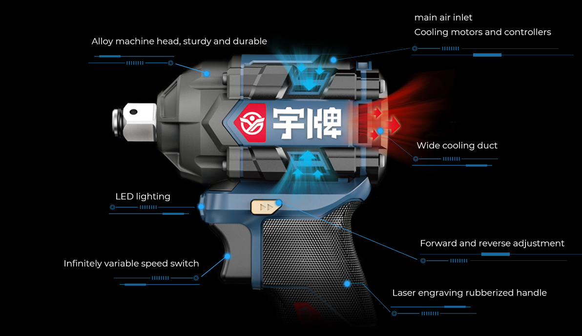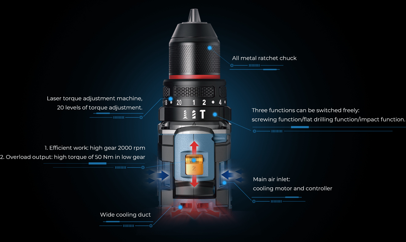Der bürstenlose Hochgeschwindigkeitsmotor erzeugt weniger Wärme und ist besser für den langfristigen Dauereinsatz geeignet. Bei gleicher Lautstärke erhöht sich die Leistung um 20 % und das Drehmoment um 30 %. Es hat einen geringen Verlust, eine gute Wärmeableitung und ist nicht leicht zu entmagnetisieren. Unter gleichen Arbeitsbedingungen erhöht sich die Lebensdauer des Motors um das Dreifache. , hohe Motoreffizienz und um 20 % erhöhte Akkulaufzeit im Einzelpack.